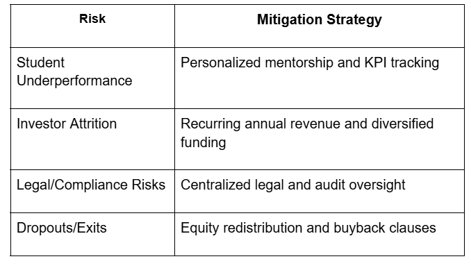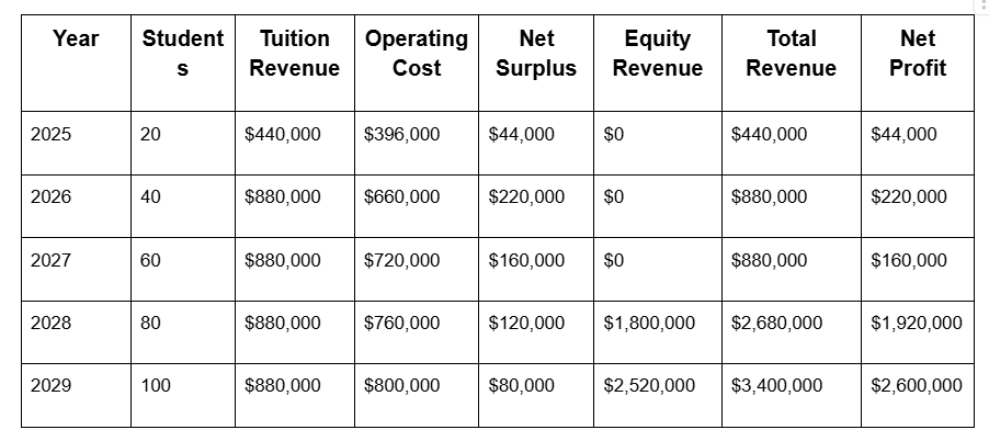 Participants earn international certifications, degrees, and active ownership in functional enterprises. The model transitions from tuition-based in early years to equity-driven in later years, ensuring long-term financial sustainability.