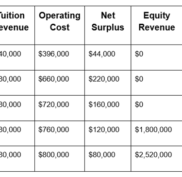 Equity revenue begins in 2028 as student ventures mature